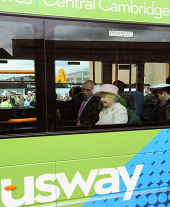 Drottning Elizabeth valde att åka buss istället för limousine när hon på torsdagen skulle inviga ett nytt medicinskt forskningscentrum i den engelska universitetsstaden Cambridge. Från järnvägsstationen i staden valde drottningen tillsammans med sin make, prins Philip, att åka med en av bussarna på den nya bussbanan i staden.