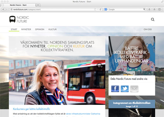En helt ny websajt om kollektivtrafik lanserades på måndagen – Nordic Future. Bakom sajten står bussoperatören Nobina, men sajten är inte tänkt som ett språkrör för företaget utan som ett oberoende forum för nyheter, opinion och kultur om kollektivtrafiken.