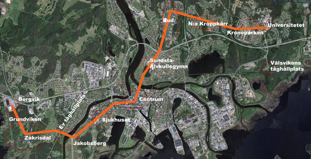 Provsträckan är tänkt att gå där dagens Karlstadsbusslinje 58 går, nämligen sträckan Nobelplan-Sundsta/Älvkullegymnasiet-Östra Bron-Haga-Karlstad C.
