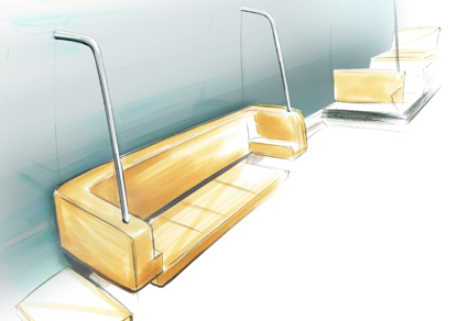 I passagerarutrymmet har det också tillkommit en lång, nerfällbar bänk. Med bänken uppfälld skapas ett antal ståplatser som kan utnyttja bänkens ryggstöd som stöd även för stående resenärer.