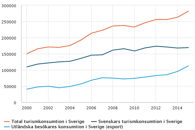 Diagrammet nedan visar omsättningen för svensk turism år 2000 – 2015 i löpande priser, miljoner kronor. Källa: Tillväxtverket.