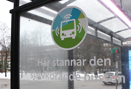 De självkörande bussarna kör en linje i Kista i norra Stockholm. Det går inte att missta sig på hållplatserna. Foto: Ulo Maasing.