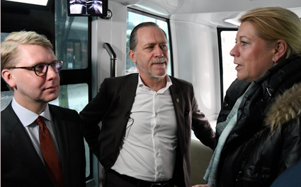 Med på premiärbussen var Stockholms trafiklandstingsråd Kristoffrer Tamsons(M), trafikborgarrådet Daniel Helldén(MP) och Catharina Elmsäter-Svärd, vd för Sveriges Byggindustrier och ordförande i Drive Sweden. Foto: Ulo Maasing.