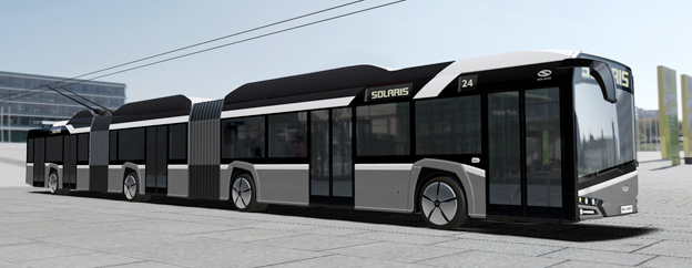 Solaris presenterar i sommar en drygt 24 meter lång trådbuss. Bussen ska vara grund för framtida dubbelledade batteri- och hybridbussar. Bild: Solaris.