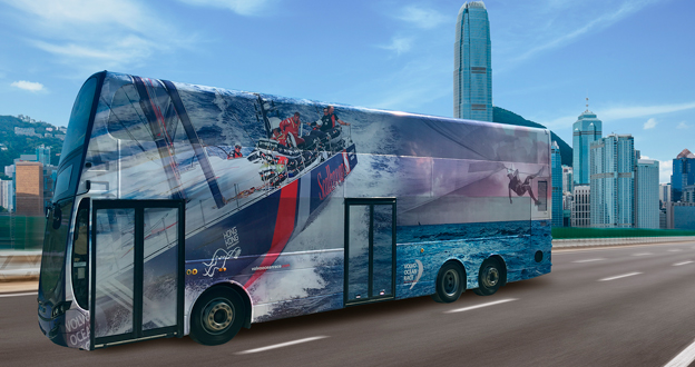 I samband med Volvo Ocean Race lanserade Volvo på torsdagen ett nytt dubbeldäckarchassi i Hong Kong. Bild: Volvo Bussar.