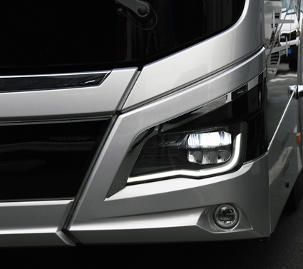 Såväl strålkastare som baklyktor utgörs av LED-lampor. Under strålkastaren finns varselljusen, även de LED. Designen känns igen från nya Lion´s Coach. Foto: Ulo Maasing.