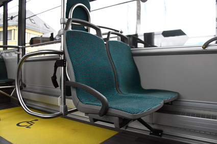 Även stolarna är nya och upphängda i skenor i väggarna utom vid hjulhusen. Det ger ett luftigare intryck men underlättar framför allt städningen. Upphängningen gör det också möjligt med en flexibel inredning. När vi har provat stolarna känns de både bekvämare att sitta i och lättare att ta sig i och ur än dagens stolsgeneration på Lion´s City.
