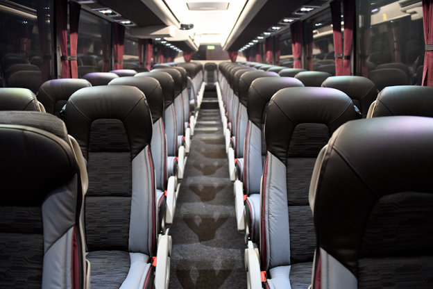 Volvo 9900 har en påfallande lyxig, men ändå diskret inredning med bland annat läderklädda nackstöd och naturligtvis det uppskattade teatergolvet.