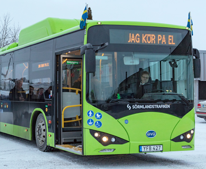 Fosilfri kollektivtrafik som drivs med förnybar el prioriteras av många svenskar. Bilden visar en av Transdevs elbussar i Eskilstuna. Foto: Transdev.