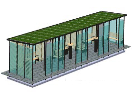 En ny typ av hållplats, avsedd för BRT-linjer, byggs på Lindholmen med glasdörrar som öppnas när bussen har stannat så att resenärerna slipper väder och vind när de stiger på och av. Bild: Västtrafik.