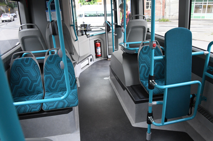 Interiör längst fram i bussen. Volvo har skapat stora ståplatsytor och gjort handtag och ledstänger ergonomiskt utformade. Foto: Ulo Maasing.
