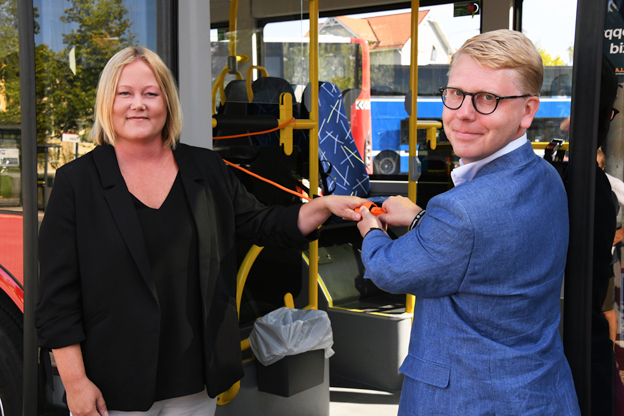 Kommunalrådet Ulrika Falk(S) i Norrtälje och Stockholms läns trafiklandstingsråd Kristoffer Tamsons(M) invigde på lördagen landets första helelektriska stadsbusstrafik. Foto: Ulo Maasing.