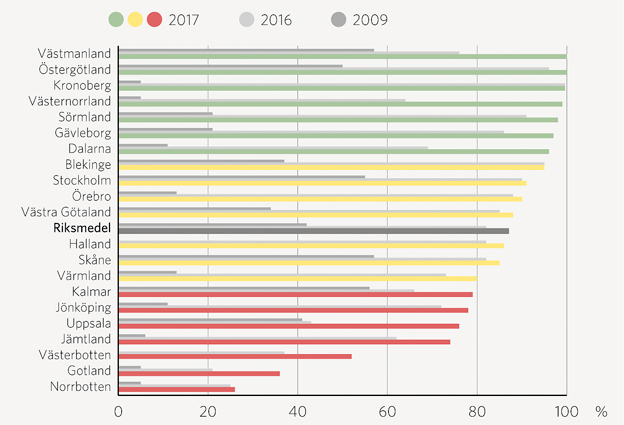 Västernorrland och Region Uppsala visar ökningar med över 30 procentenheter under 2017, beroende på konvertering från diesel till HVO (hydrerad vegetabilisk olja) och i Uppsala även en ökad andel biogas. Särskilt i norra delen av Sverige visar de flesta län en mycket hög utvecklingstakt.