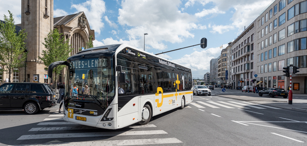 En av Volvos elbussar i trafik hos bussföretaget Sales-Lenz i Luxemburg. Sommaren 2019 införs nolltaxa i all kollektivtrafik i storhertigdömet. Foto: Volvo Bussar.