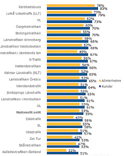 Så nöjda är kollektivtrafikens kunder hos olika länstrafikbolag och trafikhuvudmän. Karlstadsbuss toppar nöjdhetslistan. De gula staplarna anger nöjdheten hos allmänheten (både de som reser kollektivt och de som inte gör det), de blå staplarna anger nöjdheten hos resenärerna. Diagram: Kollektivtrafikbarometrn.