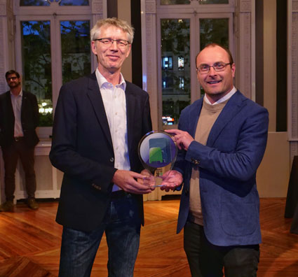 Bernd Hülsmann, marknadschef för Minibus GmbH i Daimlerkoncernen, och Tom Terjesen, redaktör för norska Bussmagasinet och ordförande i den jury som utser årets turistbuss, årets buss och årets minibuss. Foto: Daimler Buses.