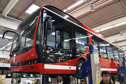 En av de elbussar som Transdev sätter in i midsommar under produktion vid BYD:s fabrik i Ungern. Foto: Ulo Maasing.