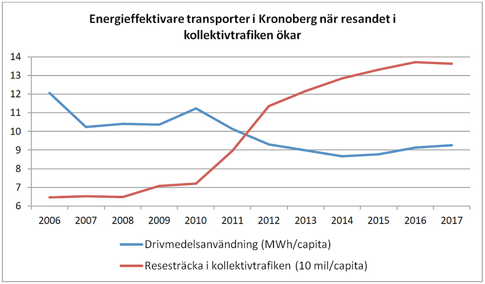 Förklaringen ligger troligen i att resandet ökar i den lokala och regionala kollektivtrafiken. Resesträckan per person och år med Länstrafiken Kronoberg har mer än fördubblats under samma tidsperiod, från 65 mil år 2006 till 136 mil år 2017 (se diagram nedan). Enligt Svensk Kollektivtrafiks Kollektivtrafikbarometer har marknadsandelen för Länstrafiken Kronoberg ökat från 11 procent år 2012 till 14 procent år 2017 – för att nå 15 procent år 2018.