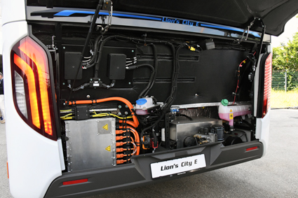 Batterierna är takmonterade, på tolvmetersversionen sex batteripaket om tillsammans 480 kWh, på den kommande ledbussen åtta batteripaket om totalt 640 kWh.