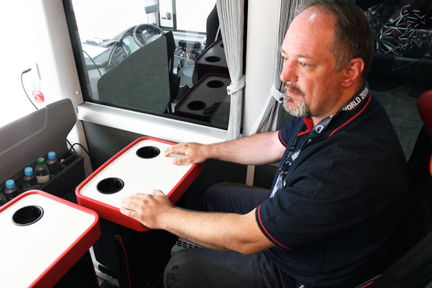 Lagledningen har de fyra främsta platserna i bussen med mycket stabila bord som är skjutbara så att man bekvämt kan arbeta med en laptop under färden. Plats för vattenflaskor finns också. Foto: Ulo Maasing.