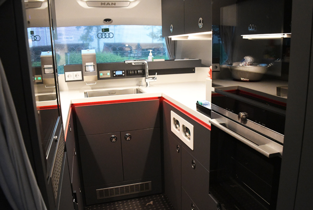 Och stjärnorna åker både säkert och komfortabelt. Säkerhetsutrustningen på deras är omfattande, likaså infotaimentystemen med bland annat fem stora monitorer, satellit-TV, en avancerad ljudanläggning, höghastighets-wifi, USB- och HDMI-uttag och så vidare. Toa finns naturligtvis, liksom ett välutrustat kök med bland annat mikrovågsugn, varmluftsugn, tre kylskåp, kaffemaskin från Nespresso (inget fjösigt busskaffe här, bara espresso!)…