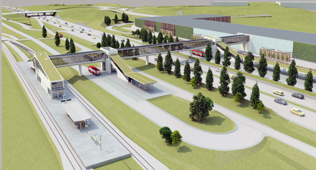 I NCC:s uppdrag ingår att bygga en väderskyddad gångbro över E18 och Roslagsbanan med hissar och rulltrappor för enkel och säker omstigning till busshållplatser i anslutning till E18 och lokalbussar samt Roslagsbanans nya station Arninge.