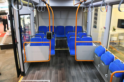 Ytterligare en buss med hjulen i hörnen och styrning på båda axlarna visades på Busworld. Det var Alstom, mest känd för sina tåg och spårvagnar, som visade upp det första serietillverkade exemplaret av sin elbuss Aptis.
