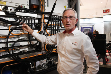 Den buss som visades på Busworld hade två battripaket om vardera tre batterier längst bak i fordonet. Teknikchefen Herman Rigternik visar. Foto: Ulo Maasing.