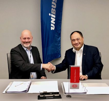 Øystein Svendsen, vd för Unibuss AS och BYD:s Europachef Isbrand Ho skrev på torsdagen avtal om 23 batteribussar för leverans till det samhällsägda norska bussföretaget.