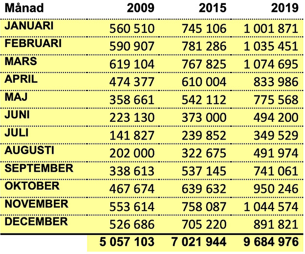 Så här ser resandeutvecklingen i Umeå ut under perioden 2009 – 2019. Tabell: Umeå kommun.