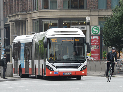 Hybridledbuss i Hamburg. I Tyskland har resandet med kollektivtrafiken minskat med upp till 90 procent. Foto: Ulo Maasing.