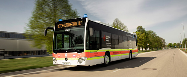 För tre veckor sedan var den en demobuss hos Daimler Buses i Tyskland – en Mercedes-Benz Citaro för regiontrafik. Byggd för 45 sittande och upp till 40 stående passagerare. Nu är den en intensivvårdsambulans som kan transportera fyra svårt sjuka covid-19-patienter, vid behov med såväl blåljus och sirener. Och med kvalificerad sjukvårdspersonal ombord.