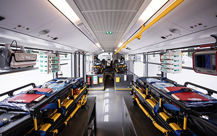 På femton arbetsdagar byggdes bussen om till en fullt utrustad intensivvårdsambulans. Foto: Daimler Buses.