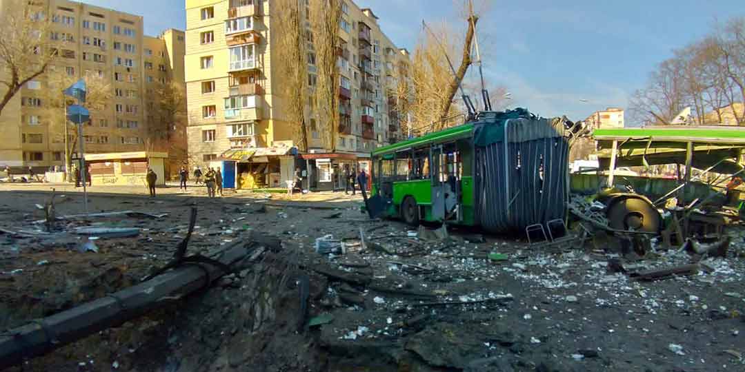 En stadsbuss i Kiev, sprängd av en rysk missil häromdagen. Den internationella vägtransportunionen IRU bryter dock inte med Ryssland. Foto: Kyiv City Council.