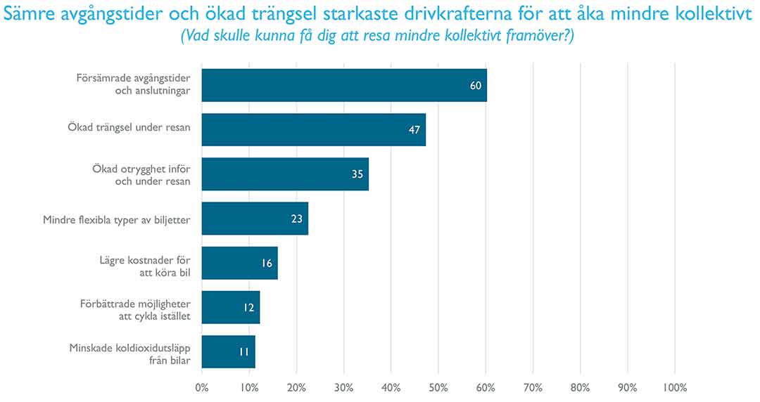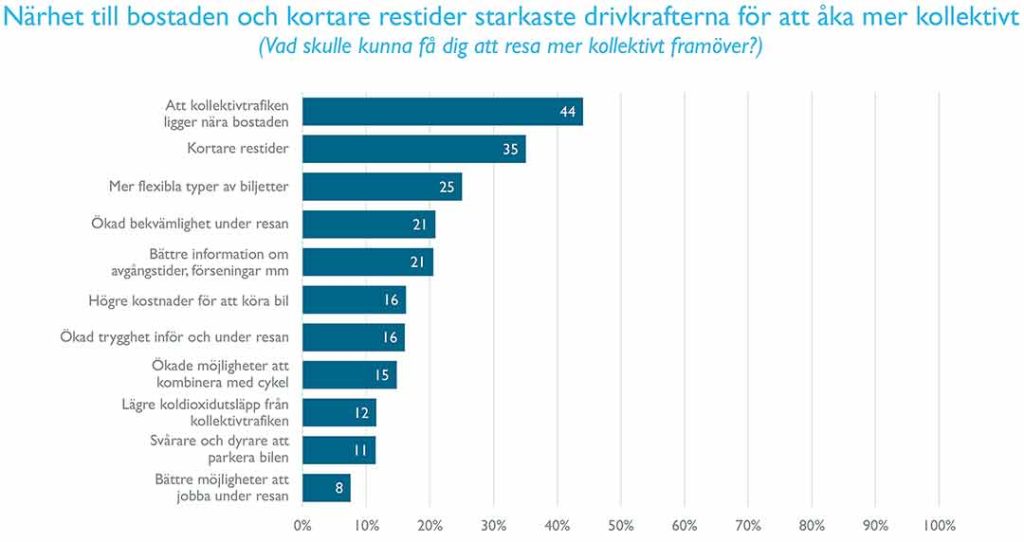 Den starkaste drivkraften är att kollektivtrafiken finns nära bostaden, den näst starkaste är kortare restider. Andra drivkrafter är flexibla biljettyper, bättre information och ökad trygghet. Klimatperspektivet, att koldioxidutsläppen från kollektivtrafiken är lägre, kommer längre ner på listan.