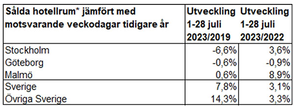 Sommaren har hittills varit stark för de svenska hotellen. Under de första fyra månaderna i juli ökade antalet sålda hotellrum i Sverige med 3,1 procent i jämförelse med rekordåret 2022. Jämfört med juli 2019, innan pandemin, ökade antalet sålda rum med 7,8 procent. Antalet sålda rum skiljer sig från olika städer. I Malmö steg antalet sålda rum med 8,9 procent i jämförelse med juli 2022 medan antalet sålda rum i Göteborg minskade med 0,9 procent i jämförelse med juli 2022. Det rapporterar besöksnäringens bransch- och arbetsgivarorganisation Visita som har tagit del av siffror från Benchmarking Alliance.