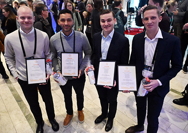 Pfrisbelönta uppsatsförfattare på Transportforum: Albin Reinhardt, Juan Manuel López, Andreas Quist och Alexander Säll. Foto: Ulo Maasing.