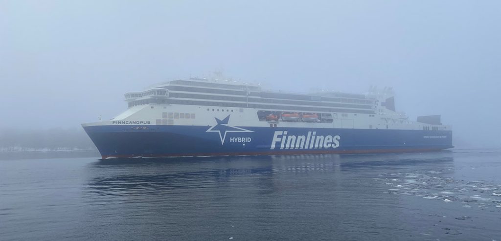 På trosdagen gjorde Finnlines nya fartyg Finncanopus ett besök i ett dimmigt Stockholm, innan fartyget nu sätts i trafik mellan Kapellskär och Nådendal. Foto: Ingrid Hansson, Stockholms Hamnar.