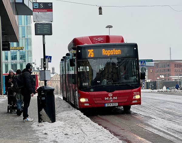 – Vänsterstyret i Region Stockholm har beslutat att ett sjuttiotal busslinjer ska få skäras ned och att ett tjugotal busslinjer ska försvinna helt. Detta med motiveringen att resandet på dessa linjer minskat kraftigt. Buss 75 mellan Cityterminalen och Ropsten är ett exempel på linje som dras in, säger Kristoffer Tamsons (M), oppositionsregionråd i Region Stockholm.