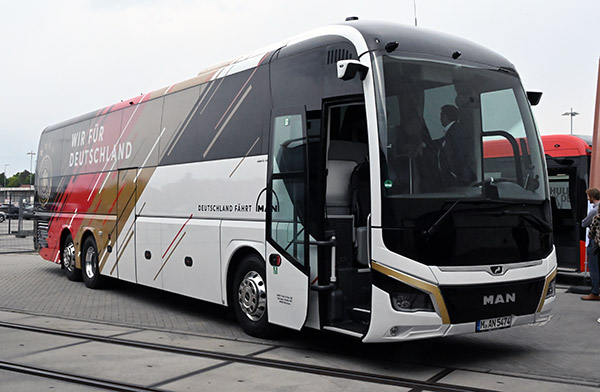 På Bus2Bus visade MAN också upp det tyska fotbollslandslagets buss, en Lion´s Coach med en (som vi tycker) läcker design. Tyskland är ju värdnation för Fotbolls-EM i år som inleds den 14 juni och där finalmatchen spelas på Olympiastadion i Berlin den 14 juli. Som bekant missade Sverige att kvala till EM.