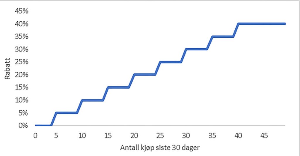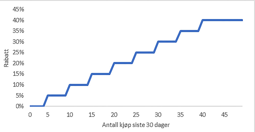 Varje steg på rabattrappan är värt fem procent i rabatt. Som mest kan resenären få 40 procents rabatt. Då krävs 40 enkelresor under 30 dagar. Efter de första 30 dagarna kommer rabatten att plana ut och ligga på samma nivå, förutsatt att kunden har ett fast resmönster.