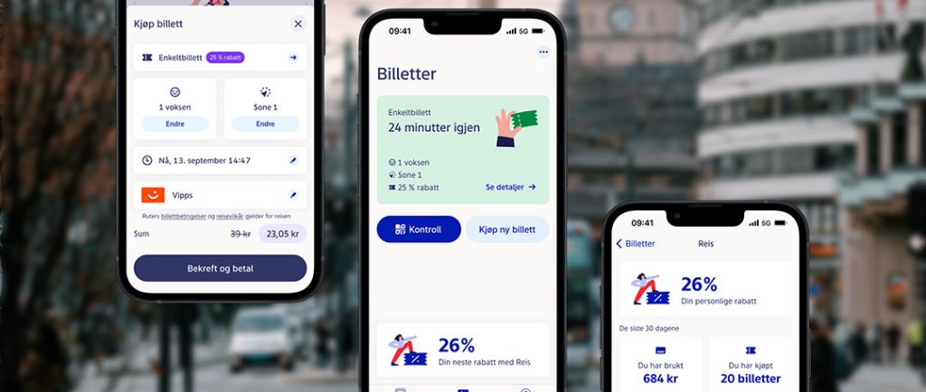 För att möta nya resmönster efter pandemin lanserade Ruter i Oslo appen Reis som ger billigare enkelbiljetter ju mer man reser. Bild: Ruter.