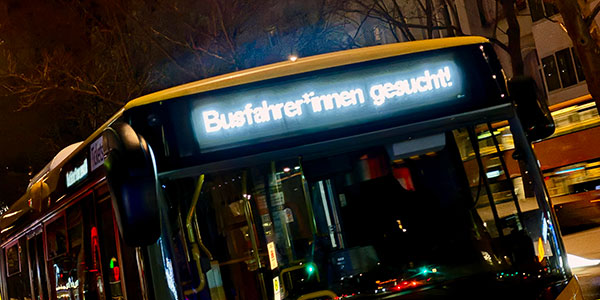 ”Bussförare sökes”. Trafikföretag runt om i Europa tar till olika grepp för att lätta på förarbristen. BVG i Berlin använder bland annat bussarnas destinationsskyltar när fordonen står stilla vid ändhållplatserna. Foto: Ulo Maasing.