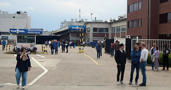 Det sista morgonskiftet lämnar Van Hools fabrik i Koningshooikt, Belgien på måndagen. Foto: Jan Voet/Transporama.