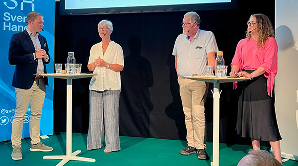 Turismfrågor debatterades på ett av tisdagens seminarier i Almedalen. Fr v: moderatorn Nils Paul, Svenskt Näringsliv, Elisabeth Angelin, Tomas Buss samt Claes Lindholtz, SJ AB.