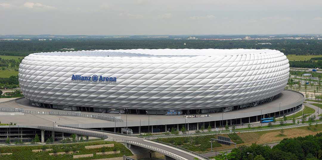 Bayern Münchens hemmaarena Allianz Arena i München ska ladda hundratals elbussar och ellastbilar om dagen. Foto: Tobias Alt/Wikimedia Commons.