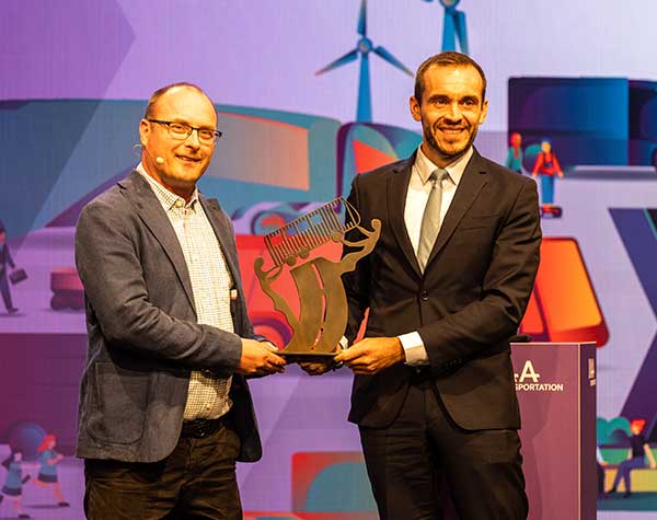 Juryordföranden Tom Terjesen överlämnade utmärkelsen för Årets Buss 2025 till Javier Iriarte, vd för Solaris. Foto: Magne Håheim.