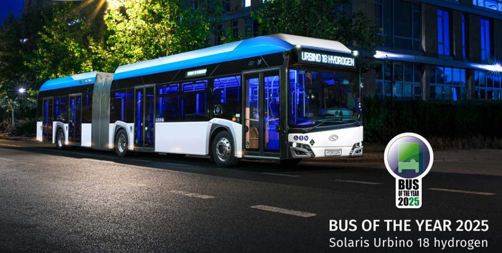 En internationell jury med representanter för ledande branschmedia från 24 europeiska länder har tilldelat Solaris Urbino 18 Hydrogen den prestigefyllda titeln Årets Buss 2025. Solaris vd Javier Iriarte tog på måndagskvällen i Hannover emot utmärkelsen från juryordföranden Tom Terjesen, chefredaktör för norska Bussmagasinet. Totalt tävlade fem stadsbussar om den mest betydelsefulla utmärkelsen i europeisk bussbransch. Sverige representeras i juryn av Ulo Maasing, redaktör för bussmagasinet.se.