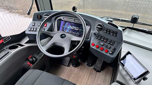 Interiören är bra konstruerad med material av god kvalitet och med omsorg även om detaljer. Två monitorer, en fram och en i mitten av bussen används för passagerarinfo.