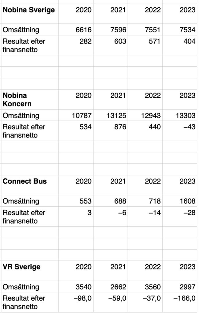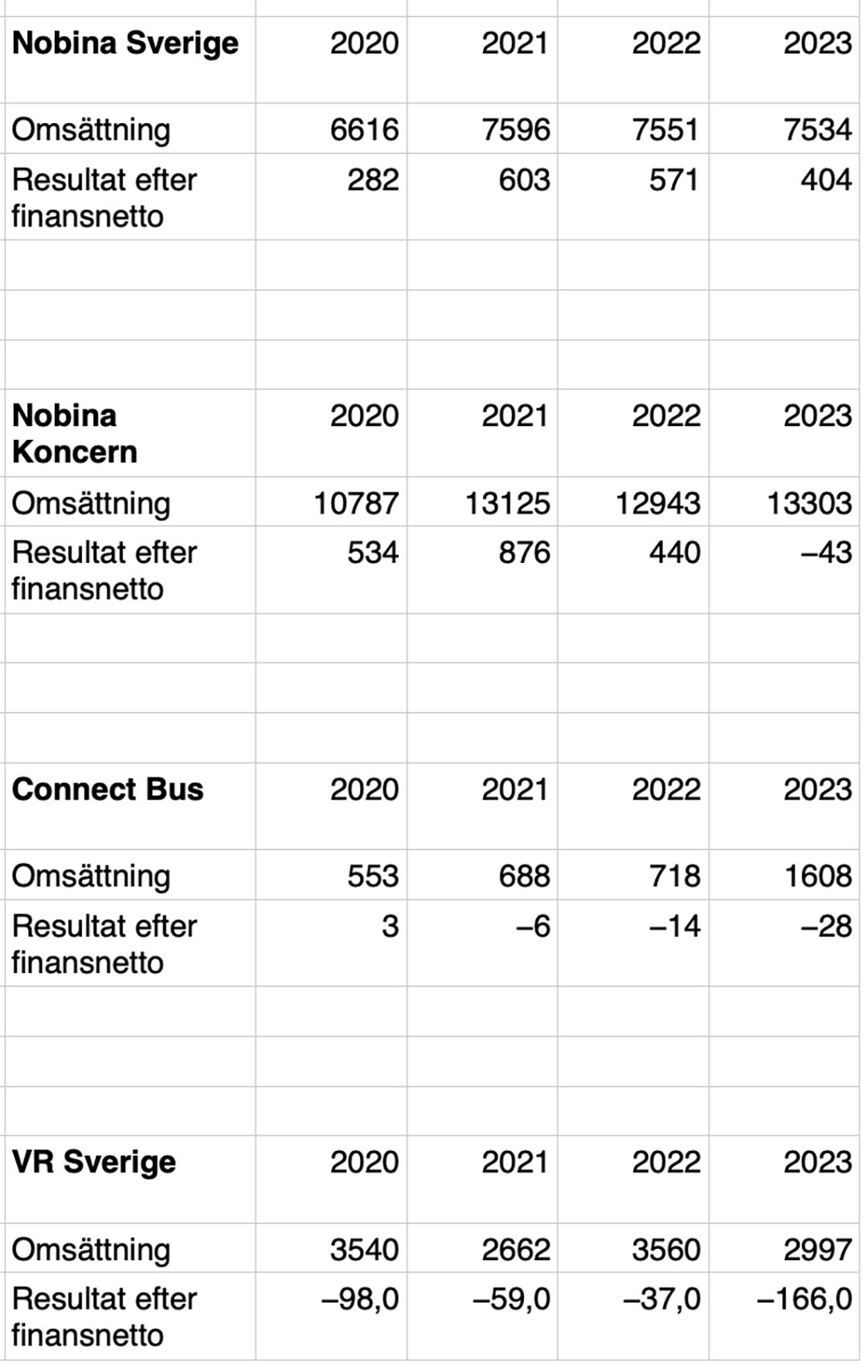 Vi har tagit fram siffrorna för åren 2020 – 2023. Några företag, exempelvis Nobina har så kallat brutet räkenskapsår. Det betyder att de inte redovisar resultatet för kalenderår, utan under en tolvmånadersperiod som börjar och slutar vid en annan tidpunkt. För Nobina löper således räkenskapsåret från första mars ett år till sista februari följande år.